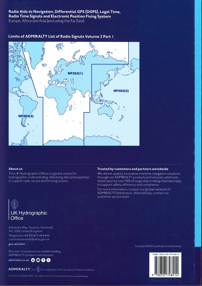 Volume 2 (NP282) - Radio Aids to Navigation, Differential GPS (DGPS), Legal Time, Radio Time Signals and Electronic Position Fixing System (Parts 1 & 2), includes radio details for: